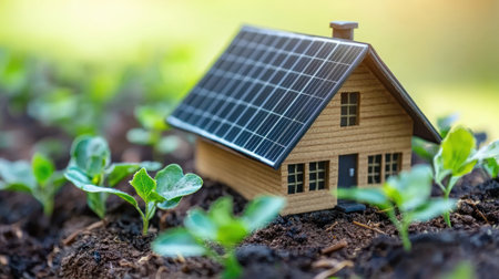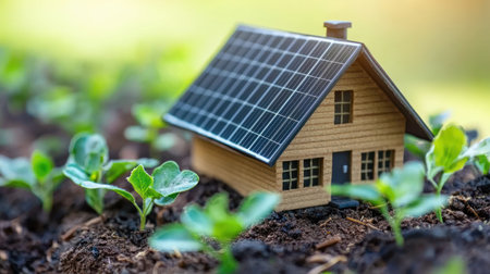 A miniature wooden house with solar panels on roof surrounded by green plants, symbolizing sustainable living