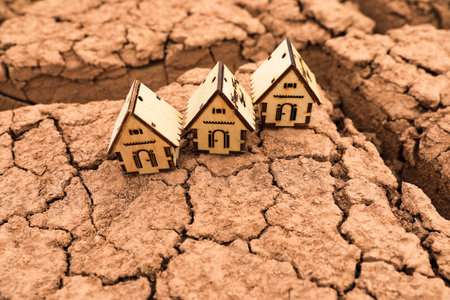 Model of a house and cracked earth depicting destruction after an earthquake. Place for text