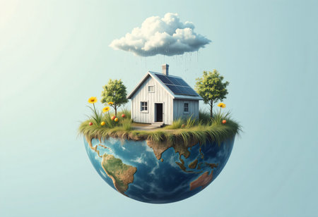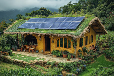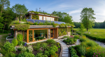 Eco-friendly house with solar panels and a green roof demonstrates sustainable living, blending seamlessly with the natural environment