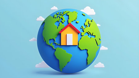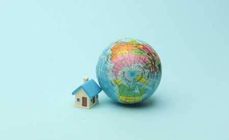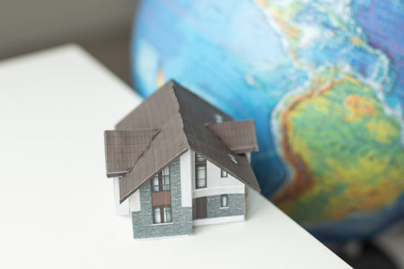Miniature House Model and Globe Representing Global Real Estate Market, International Relocation, and World Property