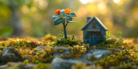 A charming miniature house sits in a vibrant garden filled with plants and flowers, set against a backdrop of majestic mountains, embodying eco-conscious living.