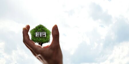 A model of the Eco-house of your dreams in your hands against the background of nature.