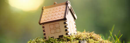 A miniature wooden house in the grass, moss on a sunny day. Eco-house. The concept of green and environmentally friendly housing.