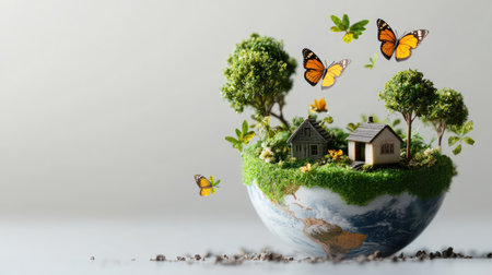 A whimsical representation of a miniature world featuring vibrant trees, charming houses, and butterflies, symbolizing harmony with nature and sustainability.