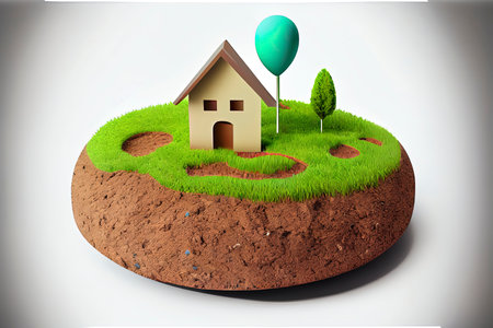 A peaceful miniature green house sits on rich soil, surrounded by dry leaves and vibrant foliage, highlighting the harmony between nature and home in a serene landscape.