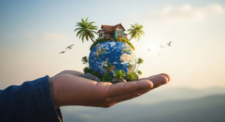 Enchanted Floating Homes Surrounded by Lush Nature on a Swirling Globe Representing Harmony Between Human Dwellings and Environment