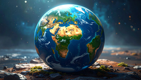 A stunning depiction of Earth surrounded by soil and rocks, illustrating the beauty of our planet amidst environmental challenges and cosmic elements.
