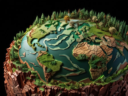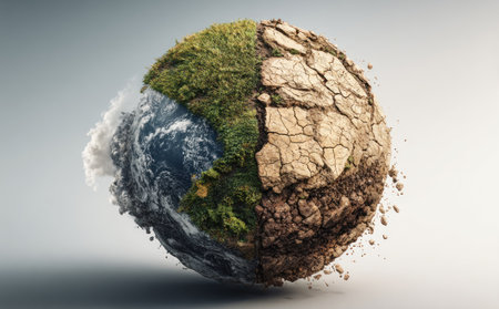 This image depicts a globe divided into sections representing different environments including water, green vegetation, and dry land. The composition highlights textures and colors within a neutral background. Suitable for illustrations about nature, environment, and conservation, the image has potential applications in various visual media.