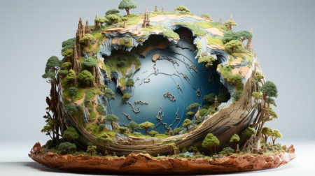 Earth in mountain lake; serene, realistic scene; digital art; environmental awareness; education; stock photo