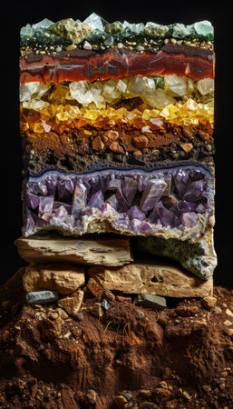 This captivating view showcases a cross-section of Earths crust, highlighting diverse layers of minerals and geological formations in remarkable detail, ideal for educational purposes.