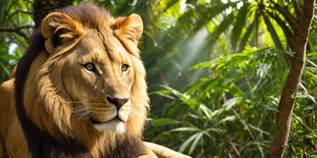 Lion in jungle on a sunny day. Beautiful tropical rainforest illustration with wild predatory beast among exotic plants with big leaves. Background with pristine nature landscape. Generative AI