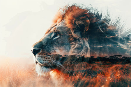 a majestic lion in a silhouette double exposure. the vast beauty of the African savannah, Immerse yourself in the artistry of double exposure, where the king of the jungle meets its natural habitat