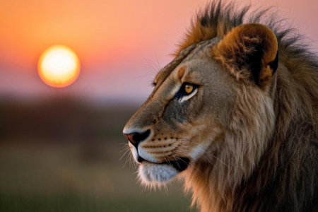 a lion with a sunset background, in the style of photorealistic detail, rim light, iconic.