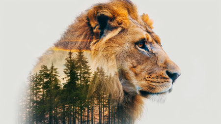 double exposure effect of a lion walking and green jungle. World wildlife day