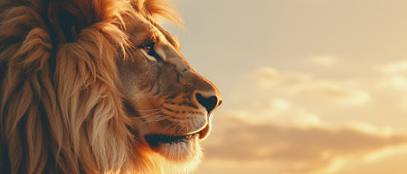 Majestic lion gazes toward the viewer, its golden mane illuminated beautifully by a warm sunset glow, creating a striking atmosphere.