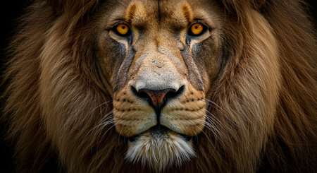 Majestic lion staring at camera, fur and mane in focus generated by artificial intelligence