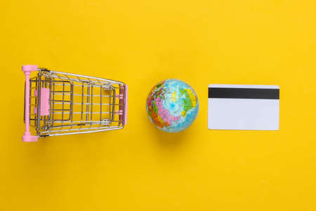 Shopping theme. Supermarket trolley with globe, credit card on yellow background. Top view