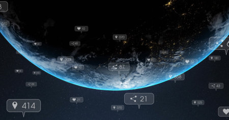 Earth globe showing lit horizon in outer space, with like, pin, share and counter badges. Planetary, digital, futuristic, technology, connectivity, communication, innovation