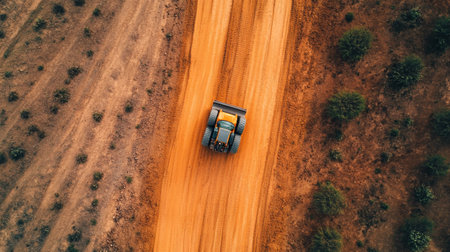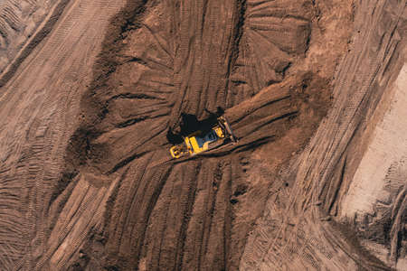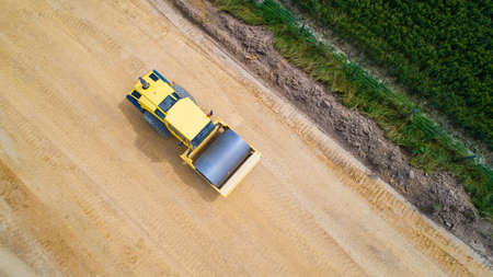 Drone outdoor shot of a professional heavy machinery in the sand during works at a road construction site of a new highway. High quality photo