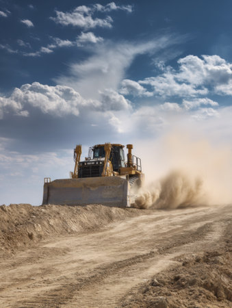 A heavy bulldozer is moving dirt and dust on a construction site, pushing earth while the sky remains partly cloudy above, indicating daytime activity.