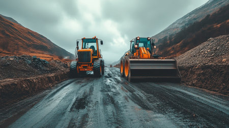 Heavy machinery is shown on a dirt road surrounded by stunning mountainous terrain and a dramatic cloudy sky, highlighting the essence of construction work.
