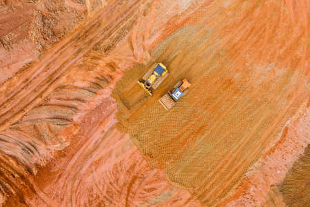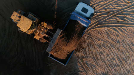 Sand mining industry, sand mine at the quarry. Scene. Aerial top view of a bulldozer machine putting sand to the truck body.