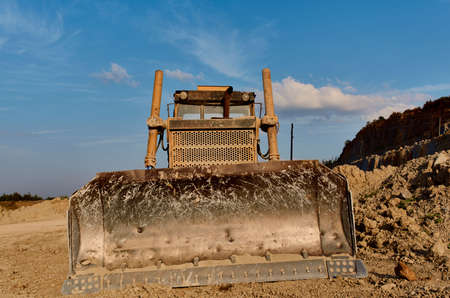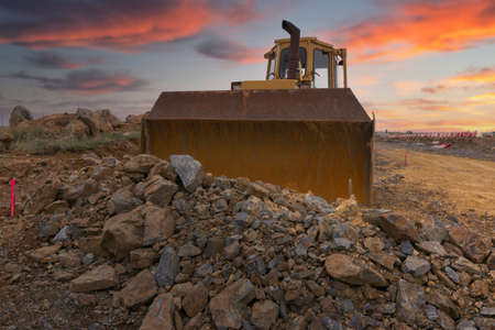 bulldozer working on a construction site at sunset. heavy duty construction equipment