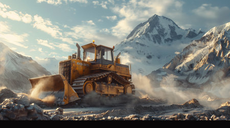 A stunning mountain landscape featuring construction equipment on rocky terrain. The clear sky and majestic peaks create a dramatic backdrop.
