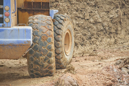 Close Up of Muddy Construction Vehicle Tire at Industrial Building Site