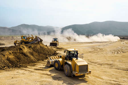 Earthworks on a summer day in mountainous areas. Wheel loaders load soil into the bodies of dump trucks. Dust from dump trucks that transport this soil