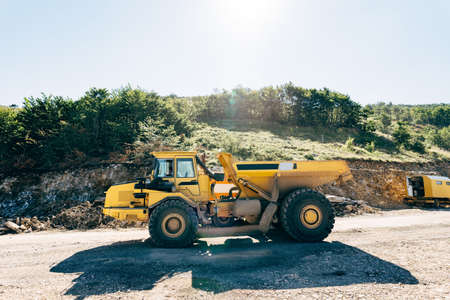 Big hydraulic dumper truck is moving over sandy ground at building site. Low angle view