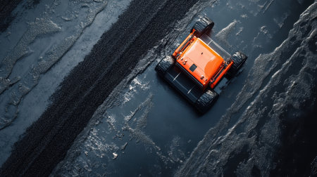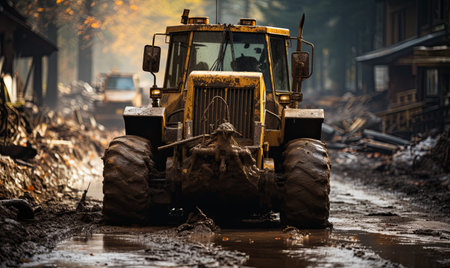 Heavy machinery with large yellow tires navigates a muddy construction site. the close-up view highlights the rugged texture of the tires and terrain, reflecting the challenges of working in wet conditions. Generative AI