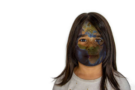 Little girl with world map painted on her face on white isolated background in close-up