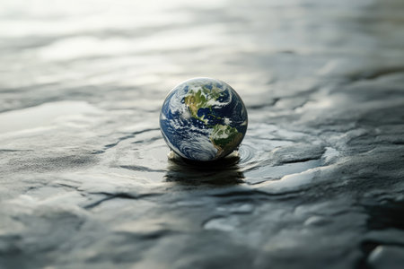 A close-up image of a miniature Earth globe partially submerged in sand, symbolizing the fragility of our planet and the need for care and responsibility towards its future.