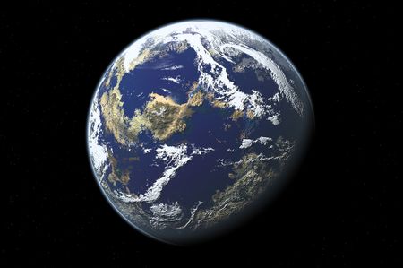3D rendering of a view of the planet Earth from space. On the surface of the planet are visible clouds, continents, oceans.