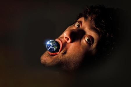 Male head silhouette is featuring digital composite Earth satellite texture on black void backdrop. Technology, innovation, globalization, ecology, connectivity, abstraction, data visualization