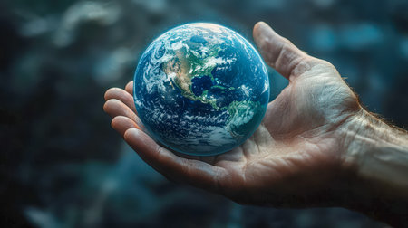 A person's hand cradles a glowing digital globe of Earth, emphasizing global ecology and inspiring eco-consciousness with a hopeful, futuristic vibe.