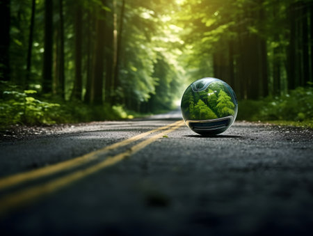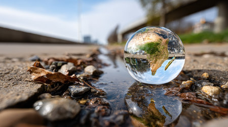 A clear crystal sphere resting on a sidewalk captures a stunning reflection of nature and urban elements, showcasing tranquility and beauty.