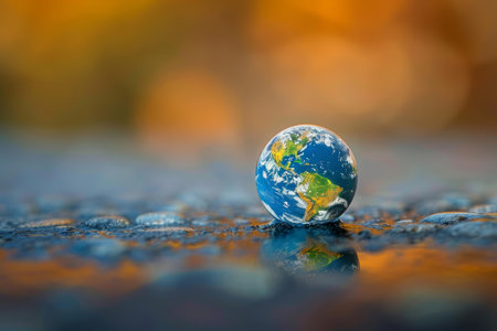 A small replica of earth rests on a reflective, moist surface with golden autumn leaves in the background