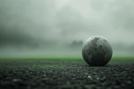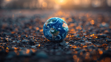 small blue marble representing Earth placed amidst a polluted, barren landscape, highlighting the consequences of human actions on the environment.