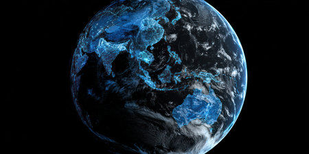 Earth illuminated night, showcasing vibrant city lights across continents, with focus Asia and Australia. image captures beauty of our planet from space, highlighting urban areas and natural