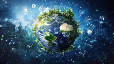 A beautiful visualization of Earth with various environmental elements, surrounded by symbols of innovation and technology,