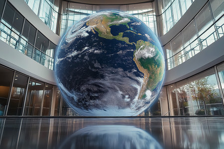 A huge globe displayed in the lobby of an office building in a modern building, showing the continents and oceans in vivid detail. Reflections are visible on the glossy floor surface.