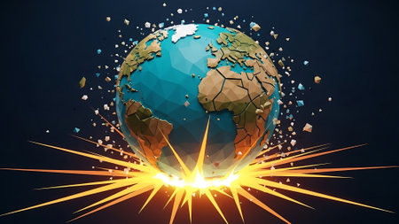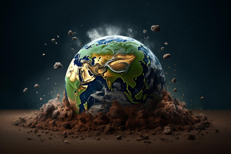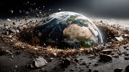 A striking image of planet Earth amidst a dramatic explosion, surrounded by flying debris and a dark cosmic background, showcases the fragility of our world.
