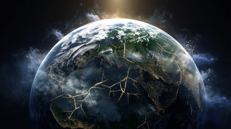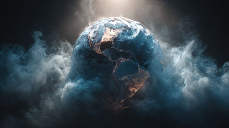 Stunning depiction of Earth surrounded by clouds, showcasing illuminated continents and oceans under dramatic lighting for environmental themes.