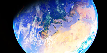 3D rendering of a view of the planet Earth from space. On the surface of the planet are visible clouds, continents, oceans.