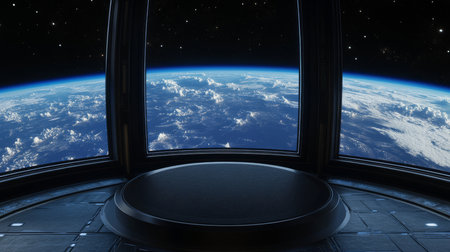 A stunning view from a futuristic space station, showcasing Earth in its captivating glory. This scene perfectly captures the essence of scifi and thrilling space exploration themes