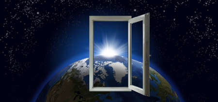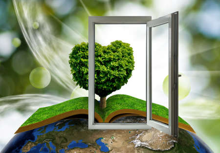 Abstract image of an open window and a tree in the shape of a heart that grows from an open book that is on a stylized globe