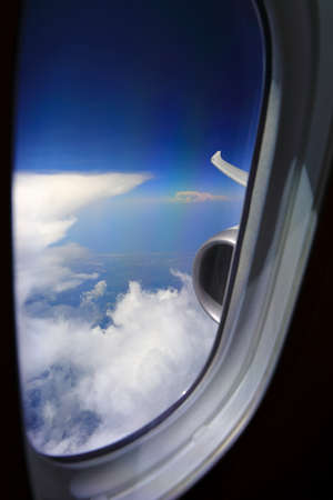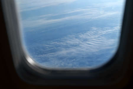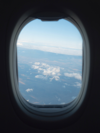Aerial view seen through the round small window of a commercial airplane flying at high altitude above the clouds.