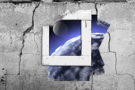 Spaceship windows overlooking the blue planet earth . Space travel concept. Place for design and text